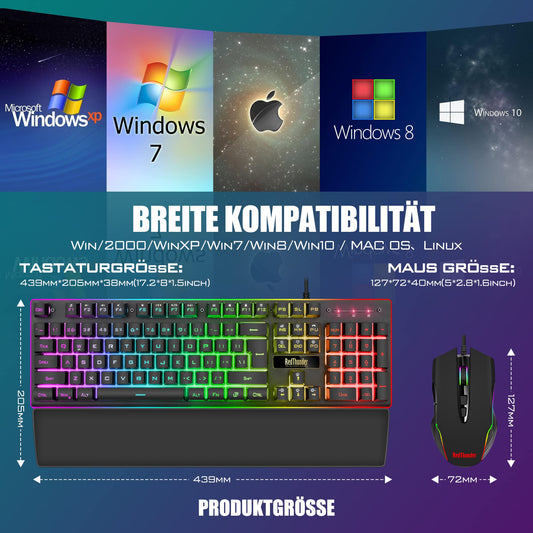 RedThunder K10 Gaming Tastatur und Maus Set, QWERTZ DE-Layout, Metallplatte und Handballenauflager,RGB-Hintergrundbeleuchtung und 7D mit Ergonomische für PC Gamer(Schwarz)
