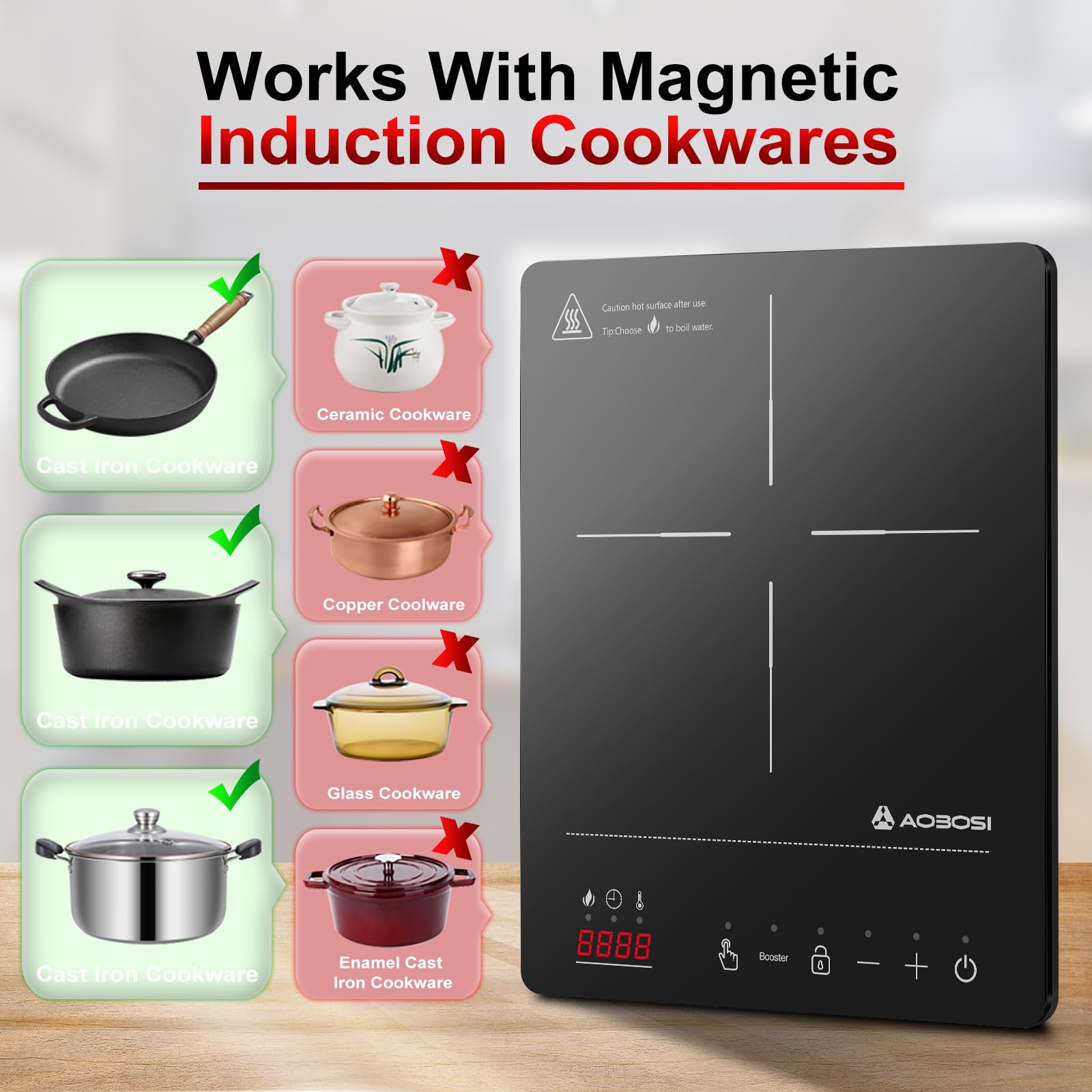 - 【Slim and Portable Design】Aobosi portable induction cooktop measures 32 x 26 x 4.2 and weighs 2.2 kg. Lighter and more portable than most induction cooktops. It can be packed into a regular travel bag. It's convenient to move and carry and doesn't take up space. It's ideal for balconies, camping, RVs, and kitchenettes.