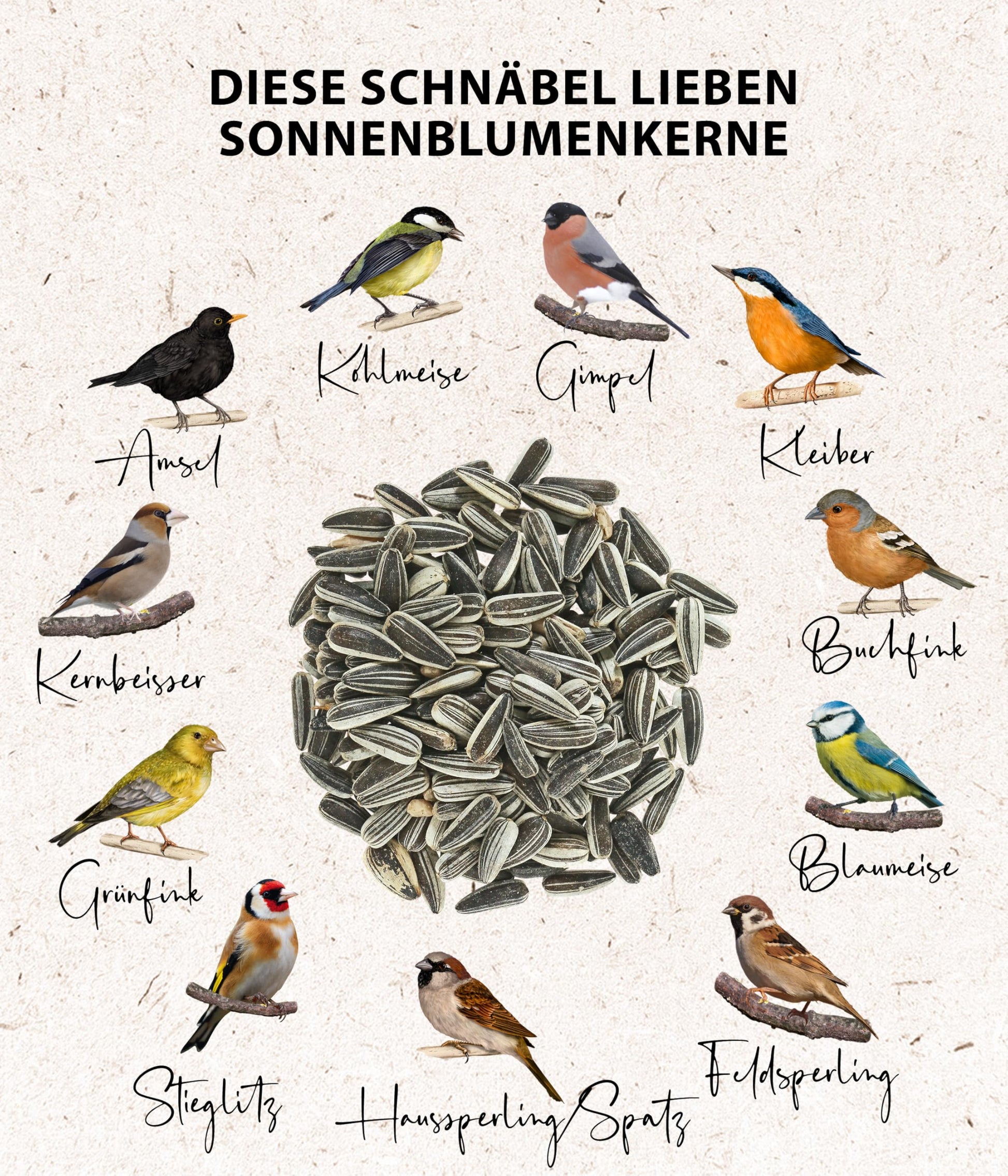 Dehner Natura Wild Bird Food Sunflower Seeds are high-quality, energy-rich seeds that help wild birds recharge their batteries – especially during the cold season or when food is scarce due to environmental factors such as monocultures and pesticides. This food reliably supports your native birds and ensures healthy and strong breeding seasons. Ideally placed in a safe and easily visible location, your garden will quickly become a popular gathering place for many feathered friends.