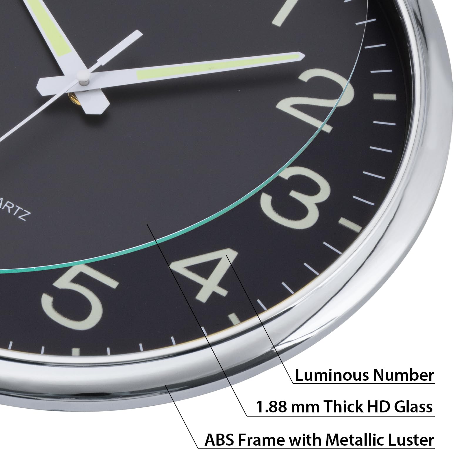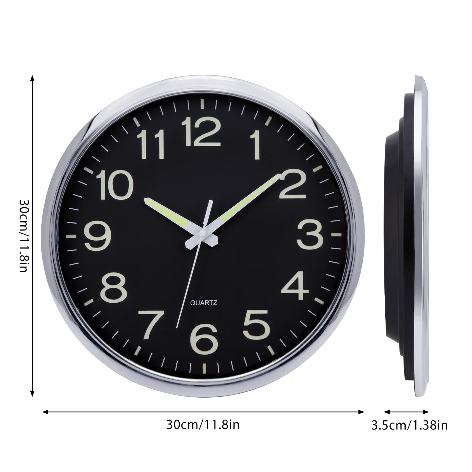 This modern 30cm wall clock in silver impresses with luminous numbers and silent operation - perfect for living room, bedroom or office.