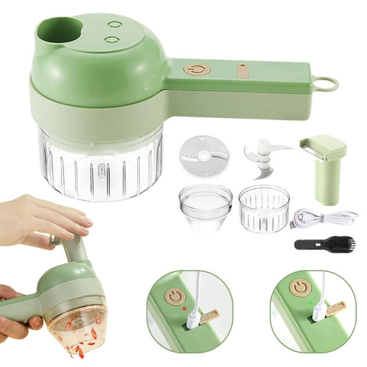 • 4-in-1 Wireless Elektrischer Gemüseschneider mit USB-Aufladung | Zerkleinern, Schneiden, Mixen und Schälen