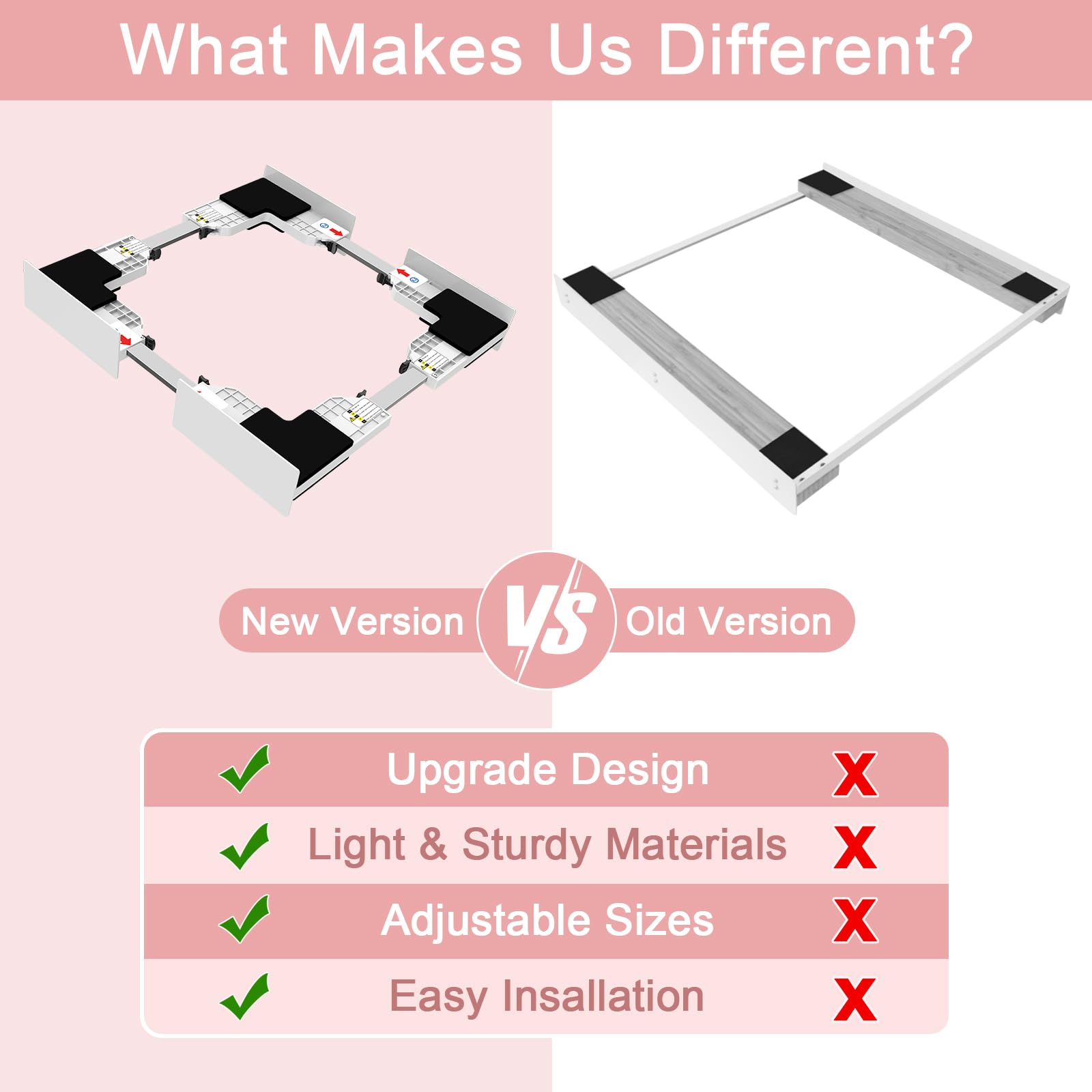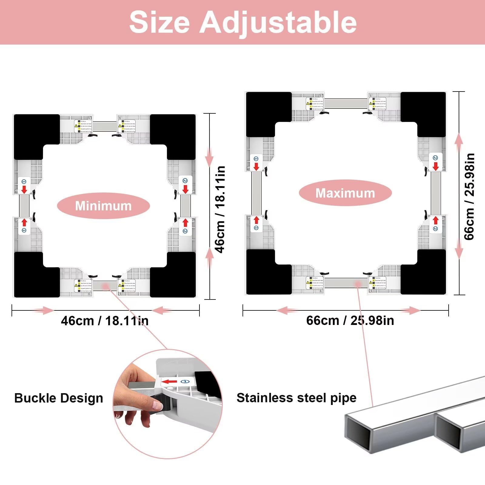 Dieses NIUXX Stapelset hilft, Waschmaschinen und Trockner platzsparend zu verbinden. Der universelle Verbindungsrahmen ist einstellbar und eignet sich für Geräte mit einer Tiefe von 46-66 cm. Die hochwertigen Materialien aus rostfreiem Stahl und Kunststoff garantieren Langlebigkeit, während das Ratschenseil und die Silikonpolster das Verrutschen der Geräte verhindern.
