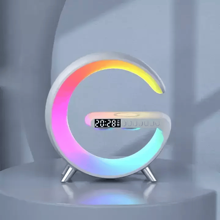 Multifunktionale kabellose Ladestation mit Wecker, Lautsprecher, RGB-Licht, und Schnellladefunktion für iPhone X, 11, 12, 13, 14, 15, Pro Max und Samsung-Geräte.